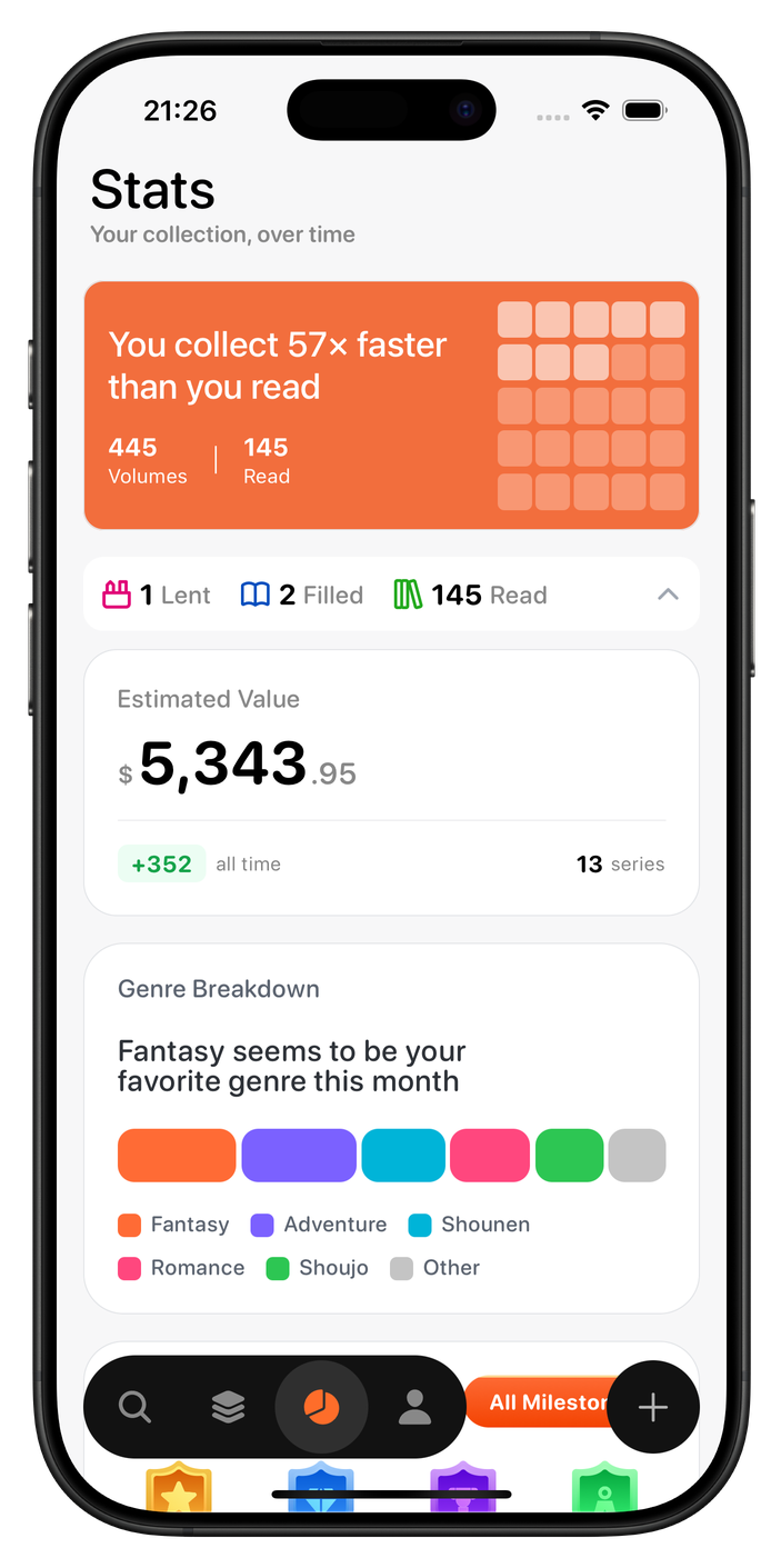 Deep insights — estimated value, genre breakdown, reading pace, and milestones.
